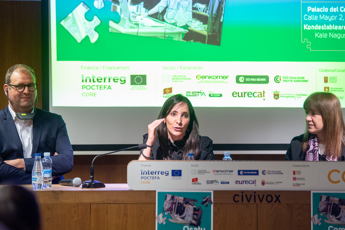 Le programme de la Conférence finale du projet CORE s’est poursuivi par une table ronde à laquelle ont participé Madame Ibone López, au nom des Poissonneries Nemo de Pampelune avec Monsieur Serge Gallazzini, propriétaire du magasin d’Arts de la table Gallazzini et Vice-président de la CCI Pau-Béarn, ainsi que Madame Maite Valmaseda, Directrice de la Fédération du Commerce de Guipuzcoa et la représentante de la Chambre de Commerce de Teruel, Madame Nuria Ros.